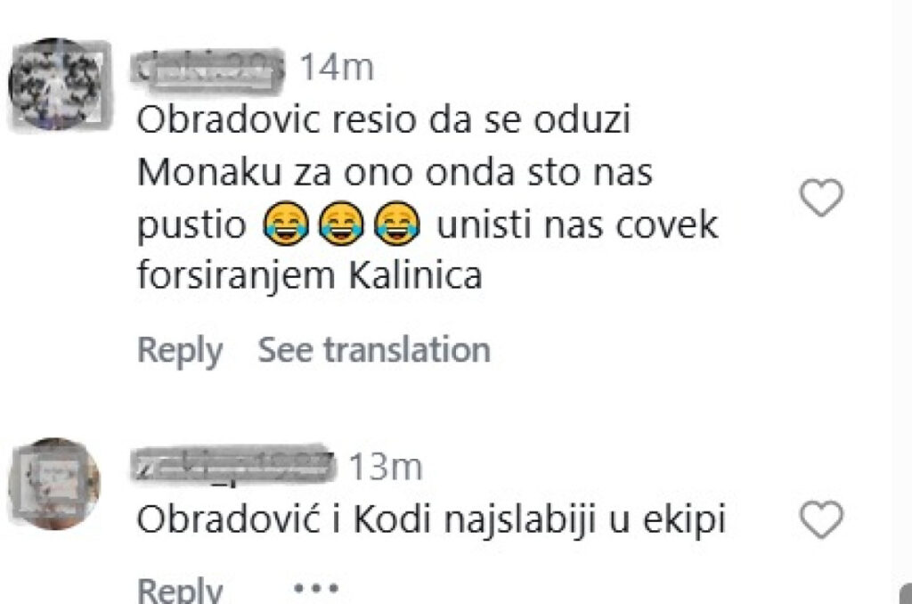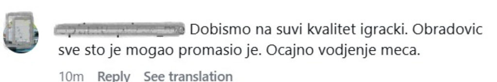 „Dobismo na suvi kvalitet igrački. Obradović sve što je mogao promašio je. Očajno vođenje meča“, „Zašto Obradović menja prvu petorku koja je odlično krenula, čim je ušla druga petorka krenulo naopako sve“,Sto Obradovic menja petorku kad nam ide“, „Povedu 10, Obradović ih sve zamijeni. Lakva truba od trenera. Sve radi da CZ izgubi. Neznalica“, „Znaci vodimo 10:20 i obradovic menja 3 igraca hahahahaha pa ovo je diletant svetski“, „Moneke usrao poluvreme, na +18 u kontranspadu zajebava se i baca loptu u aut i umesto da odemo i mozda na +25 vraća ih u život, Kalina opet totalno van utakmice“, „Sale i Čime se bore da sjebu uz pomoć Kodija“, „Opet će nas koštati Obradovićeve glupe izmene kao i bez ideje u napadu i lošija odbrana u drugom poluvremenu“, „ako izgubite ovo necu da pratim vise, znaci celu utakmicu ih imamo i sad ovako jadno, ne zasluzujemo da idemo dalje“, „Jbt!!!!! 18 koševa razlike i opet gubimo… dokle više“, komentari su navijača Zvezde na društvenim mrežama.