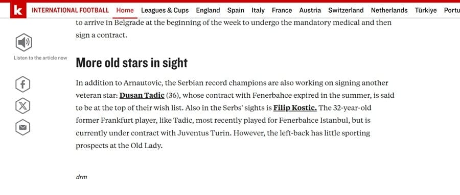 Uz Arnautovića, srpski šampion takođe radi na dovođenju iskusne zvezde Dušana Tadića (36), kome je ovog leta istekao ugovor sa Fenerbahčeom. On im je na vrhu liste prioriteta. Takođe, srpski klub ima na oku i Filipa Kostića, 32-godišnjeg igrača koji je nekada nastupao za Ajntraht. Do nedavno je igrao za Fenerbahče, kao i Tadić, ali je trenutno pod ugovorom sa Juventusom. Ipak, Kostić nema previše prostora u viziji torinskog kluba – naveo je Kiker.
