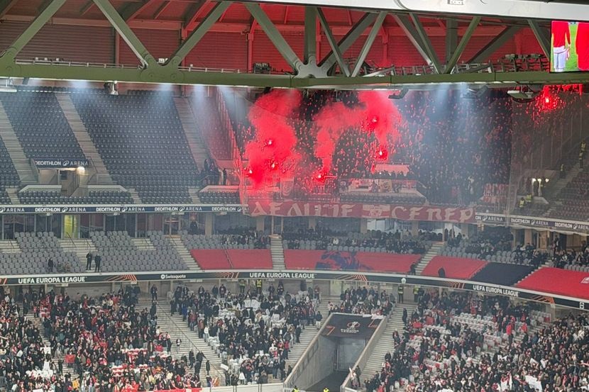 Obe grupe navijača su priredile njima karakterističan piro šou – Prvo smo mogli da vidimo koreografiju navijača Lila, dok je posle usledila bakljada Delija na drugoj strani. Utakmica je tek počela a stiče se utisak da je temperatura u Francuskoj dostigla maksimum, što je i jasno kada se zna ulog u ovom dvomeču.